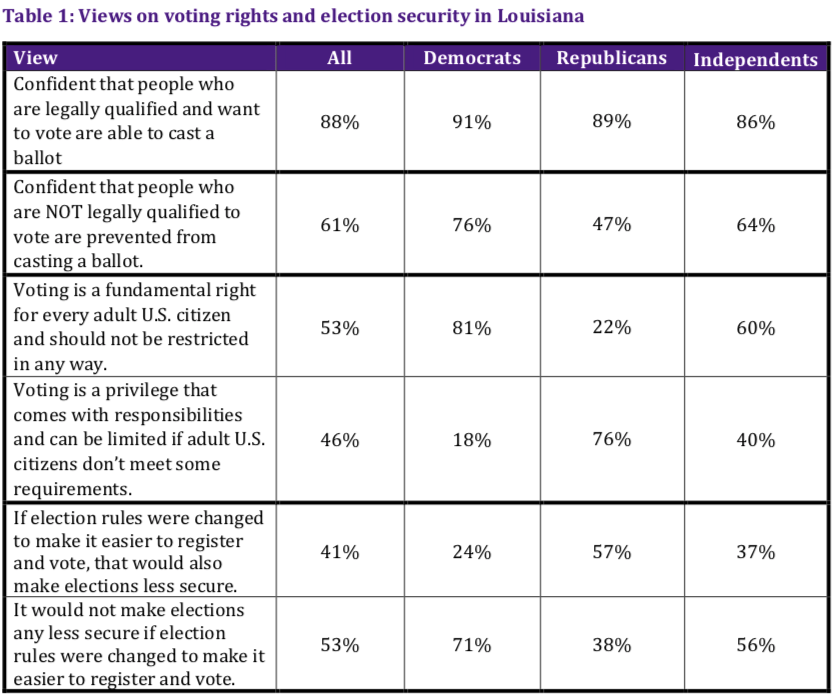 Table showing views on voting rights and election security among political parties in Louisiana. (2022 Louisiana Survey)